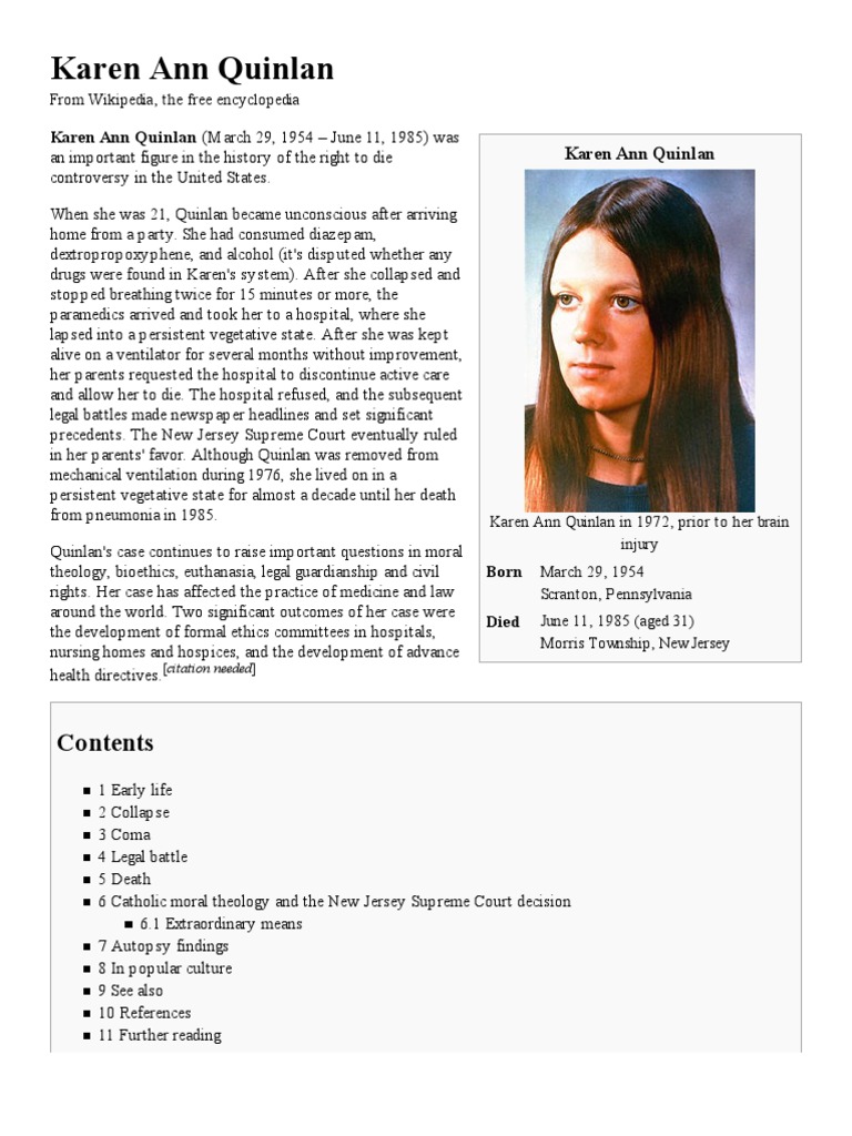 The litigation has to do in final analysis with her life-its continuance or cessation-and the responsibilities rights and duties with regard to any fateful decision. Caso Karen Ann Quinlan Karen Ann Quinlan nació el 29 de marzo de 1954 en Scranton Pennsylvania. Biography March 29 1954 June 11 1985 His answer made the following points.